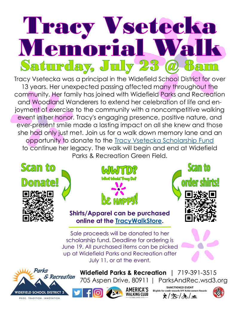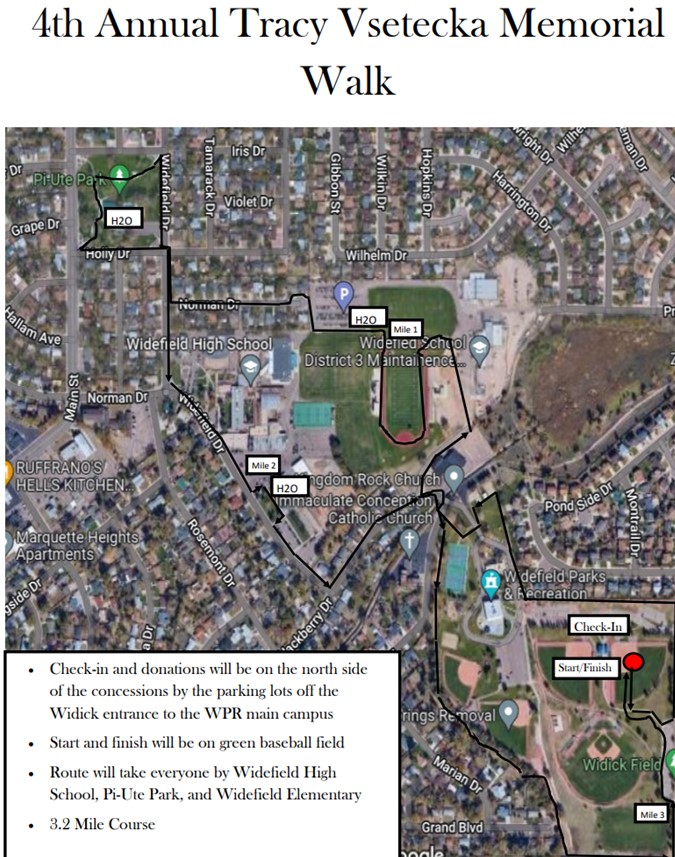 Kirk and Tracy's family would like to thank everyone for coming to this year's Tracy Vsetecka Volksmarch. Also, a big thank you to Widefield Parks and Recreation for hosting and organizing the event! Below are some pictures from the event on July 23th, 2022, along with the original event information! Hope to see everyone back for the 2023 March!